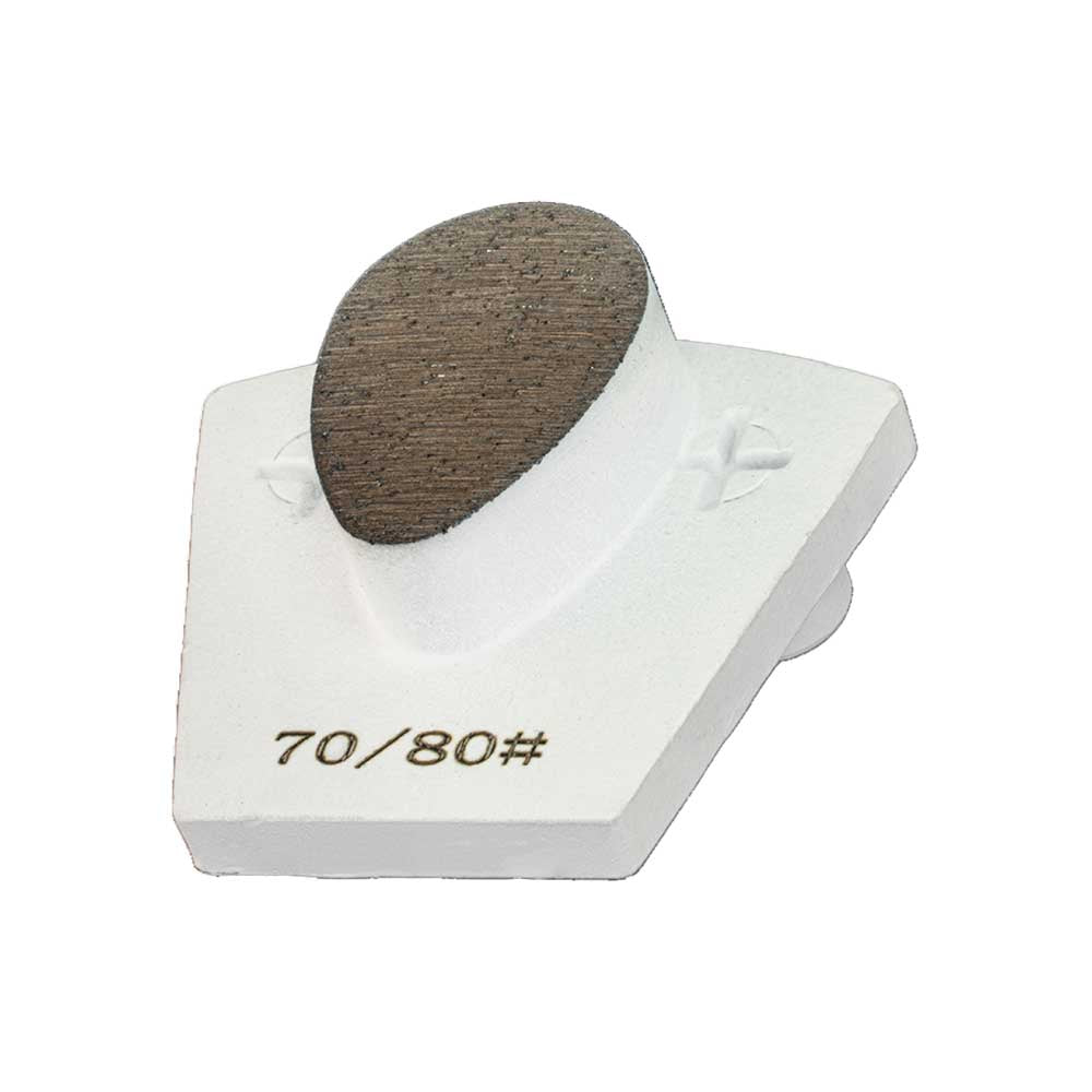 The WerkMaster beveled teardrop short segment 70/80 grit tooling works in concert with single segment tooling to achieve efficient surface penetration with the Boss 4-In-1 Ultra Floor System. This tooling attaches to Plug 'N Go plates, and has a soft bond for hard concrete with Mohs 7.5-9 hardness. When used with single segment tooling, the beveled teardrop design easily helps to penetrate surface coatings like paint, epoxy, sealers, and more. This tooling uses a polycrystalline diamond abrasive, which will hold up for a lifespan finishing up to 18,000 Sq. Ft.