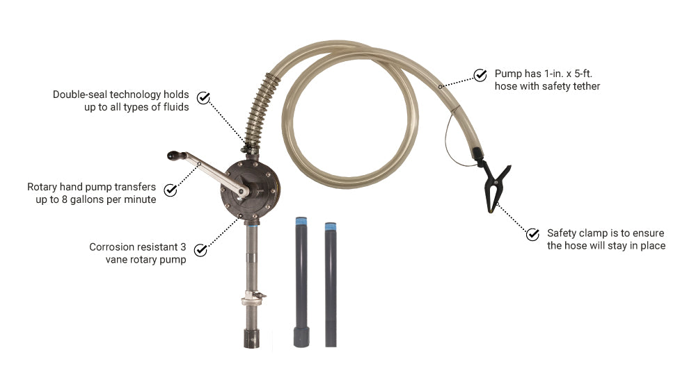 • Barrel Pump: Adapts to standard 15, 30, and 55 gallon barrels with our bung adaptor